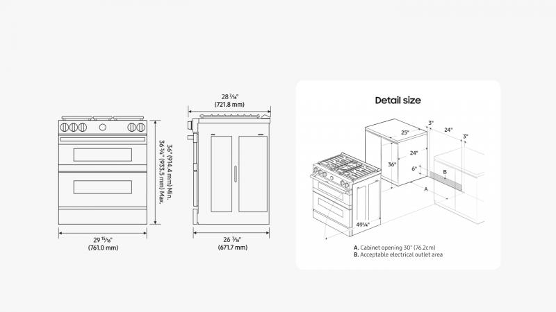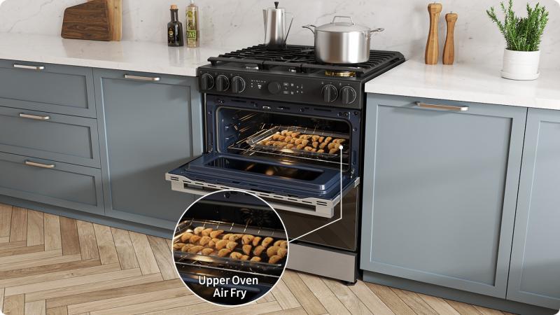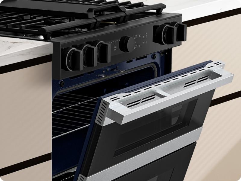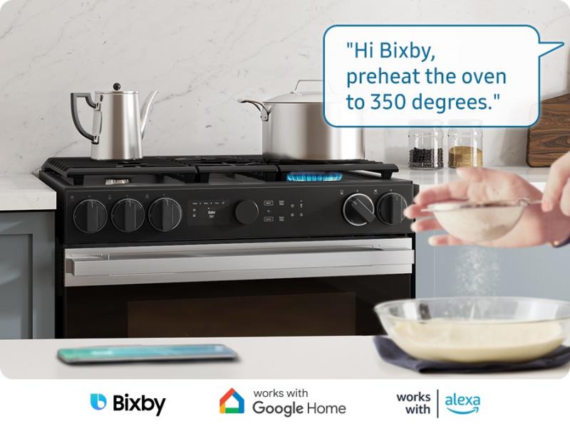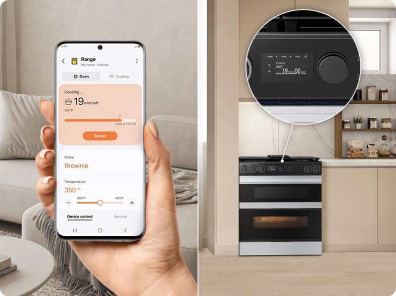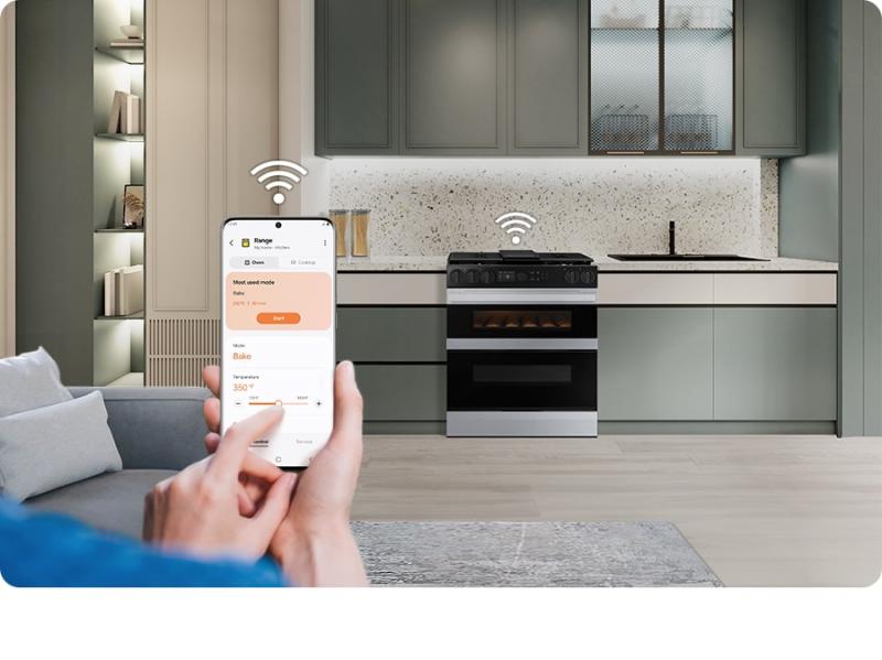 * Available on Android and iOS devices. A Wi-Fi connection and a Samsung account are required. ** This feature is only compatible with the oven section of the range. *** How thoroughly each dish is cooked may vary depending on the type and weight of ingredients.