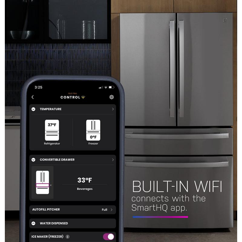 This refrigerator utilizes built-in Wi-Fi, powered by the SmartHQ app, to send instant alerts to your smart device, allowing you to conveniently customize your interior settings