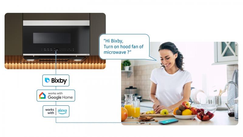 Monitor the microwave and cook with just your voice. Using a voice assistant*, like Samsung Bixby**, Amazon Alexa*** or Google Assistant****, you can check its status or control it. You can also tell Bixby what dish to cook***** and it sends the recipe to the microwave to cook it automatically.