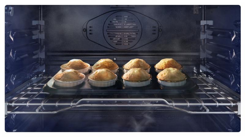 * Available on Android and iOS devices. A Wi-Fi connection and a Samsung account are required. ** Camera is located at the top of the oven; view of lower racks may be obstructed. For ingredient recognition, a single ingredient dish should be placed in the center of the oven, unobstructed. Keep camera lens clean. AI recognition accuracy depends on usage conditions; for more detailed information, please refer to the user guide.