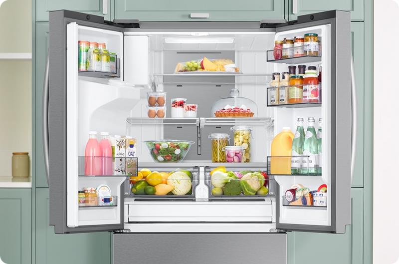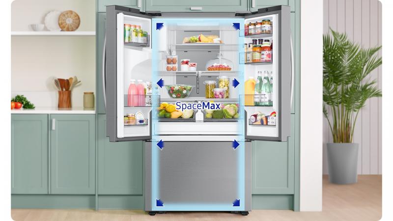 Store more and much larger food items, and access them easily. It has the largest* capacity of Samsung’s French Door refrigerators. SpaceMax™ technology makes the walls much thinner**, so it creates more space inside without increasing the external dimensions or compromising energy efficiency.