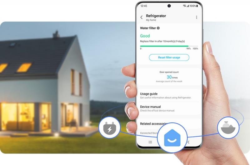 * Available on Android and iOS devices. A Wi-Fi connection and a Samsung account are required. ** SmartThings Energy currently works with around 40 Samsung home appliances that are SmartThings enabled. These include refrigerators, washing machines, clothes dryers, dish washers, air conditioners, air purifiers, vacuum cleaners, ovens, hoods, cooktops, microwave ovens, TVs (from June 2022) and energy meters.