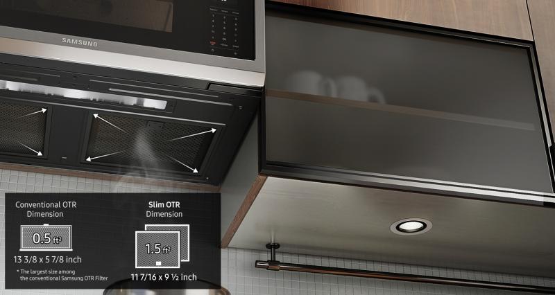 Enhance the look of your kitchen with the low-profile design of the slim OTR. It fits into the same space as an undercabinet hood meaning you can maximize your food preparation space by moving your microwave off the countertop. While slim, it still has a sizeable 1.1 cu. ft. capacity that will easily hold cooking utensils of various sizes, including tall glasses, wide plates and big bowls.