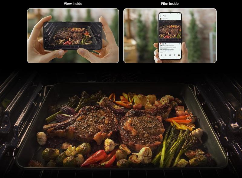 Make cooking easy and shareable! An internal Oven Camera* lets you see inside the oven. Using the SmartThings App** on a smartphone or even the TV*** you can quickly check your cooking without opening the door. It also lets you create a video clip**** of the highlights to share on social media!