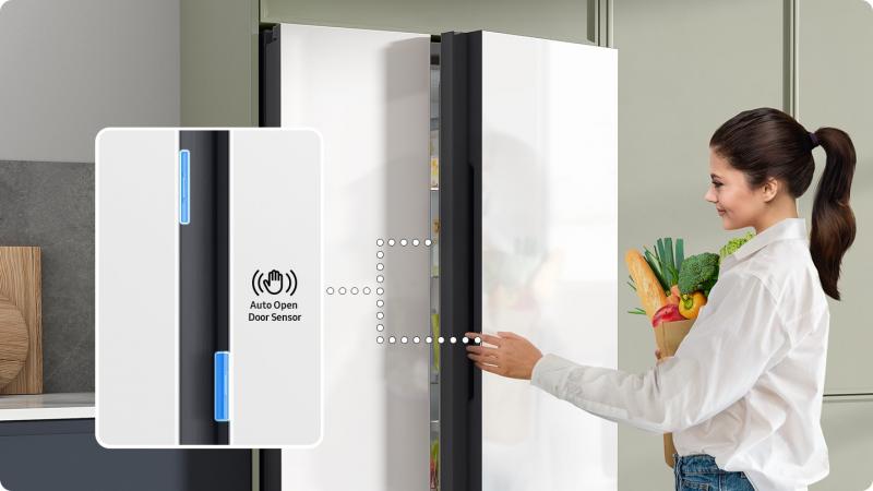 Open the refrigerator doors with less effort. The doors have sensors on both sides that help you open them by releasing the seal* when you touch them. It also makes a sound to alert you as it opens. With no handles sticking out, it has a stylishly seamless appearance.