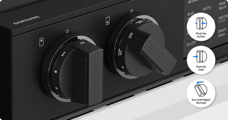 Samsung’s new knob design lets you precisely control and activate your cooktop. The knob buttons must be pinched in on both sides before the knobs can be pushed and turned.