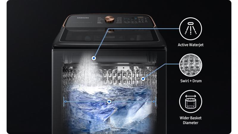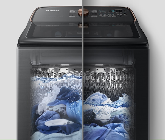 * As compared to Samsung model WA7700A. Based on internal testing on a 8lb load containing 1g of dog hair. The WA7700A using a Normal cycle removed 4% of pet hairs and the WA7550C using the Pet Care Wash cycle and Pet Hair Filter removed 24% of pet hairs. ** Based on internal testing of the rinsing ratio, which measures the water’s electrical conductivity to assess the amount of detergent remaining before and after rinsing. The rinsing ratio using the Pet Care Wash is 1.05 compared to 0.402 with a Normal cycle, which is a 2.6 times better rinsing performance. *** Tested by Hanyang University based on Samsung internal protocols. Results provided to and interpreted by Intertek and Witness Report provided on April 18th 2023. Tested using IEC A* detergent and an IEC 8lb load containing a 10x10cm fabric specimen polluted with hair, dead skin and dust from dogs and cats. Result: removed 99% or more of the dog/cat allergens tested. Dog allergens (Can f 1) had an average input of 462.0 ± 41 ng/mL and an average output of 2.6 ± 1.5 ng/mL. Cat allergens (Fel d 1) had an average input of 67.2 ± 3.7 ng/mL and an average output of 0.2 ng/mL or less. Results may vary depending on actual usage conditions.