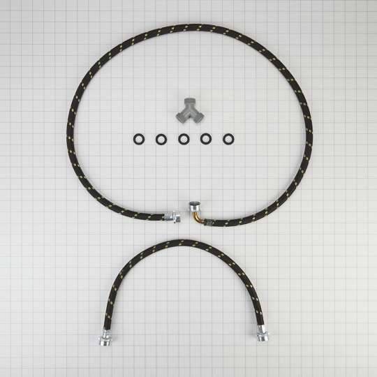 This Steam Dryer Hose Kit includes the hoses and adapters needed to replace your existing steam hose assembly. This kit includes (1) Y-connector, (1) 2' hose, (1) 5' hose and (5) rubber washers. The 90-deg elbow saves space and helps prevent kinking, while the braided polyester reinforced layer of the hoses adds strength and durability. This is an accessory that can be used across several steam dryer brands; check to see if your model number is compatible. Replacing this accessory will require basic hand tools, some disassembly of the appliance and novice repair experience. You must unplug the dryer or shut off the house circuit breaker for the appliance before installing this part. Also make sure you turn off the water supply to the dryer.