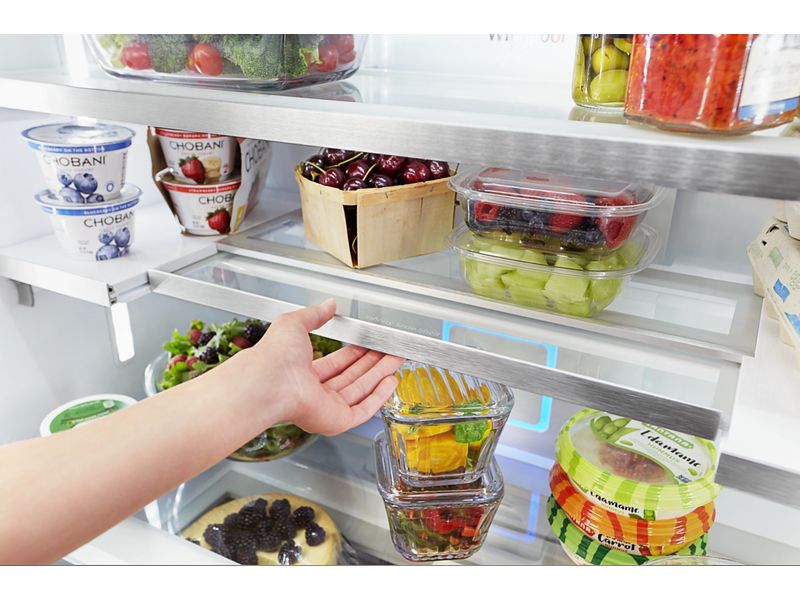 Get purposefully designed zones for items you use most with this counter depth french door refrigerator. A unique shelving system in this refrigerator lets you store 30% more with features like the auto-humidity crisper drawer to help keep fruits and veggies fresh. Refrigerator LED lighting also keeps food looking as good as it tastes.
